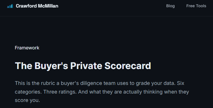 This scorecard is built from patterns across dozens of mid-market transactions. The categories, the rating criteria, and the buyer commentary reflect what actually happens in diligence, not what advisors tell you in pitch decks.